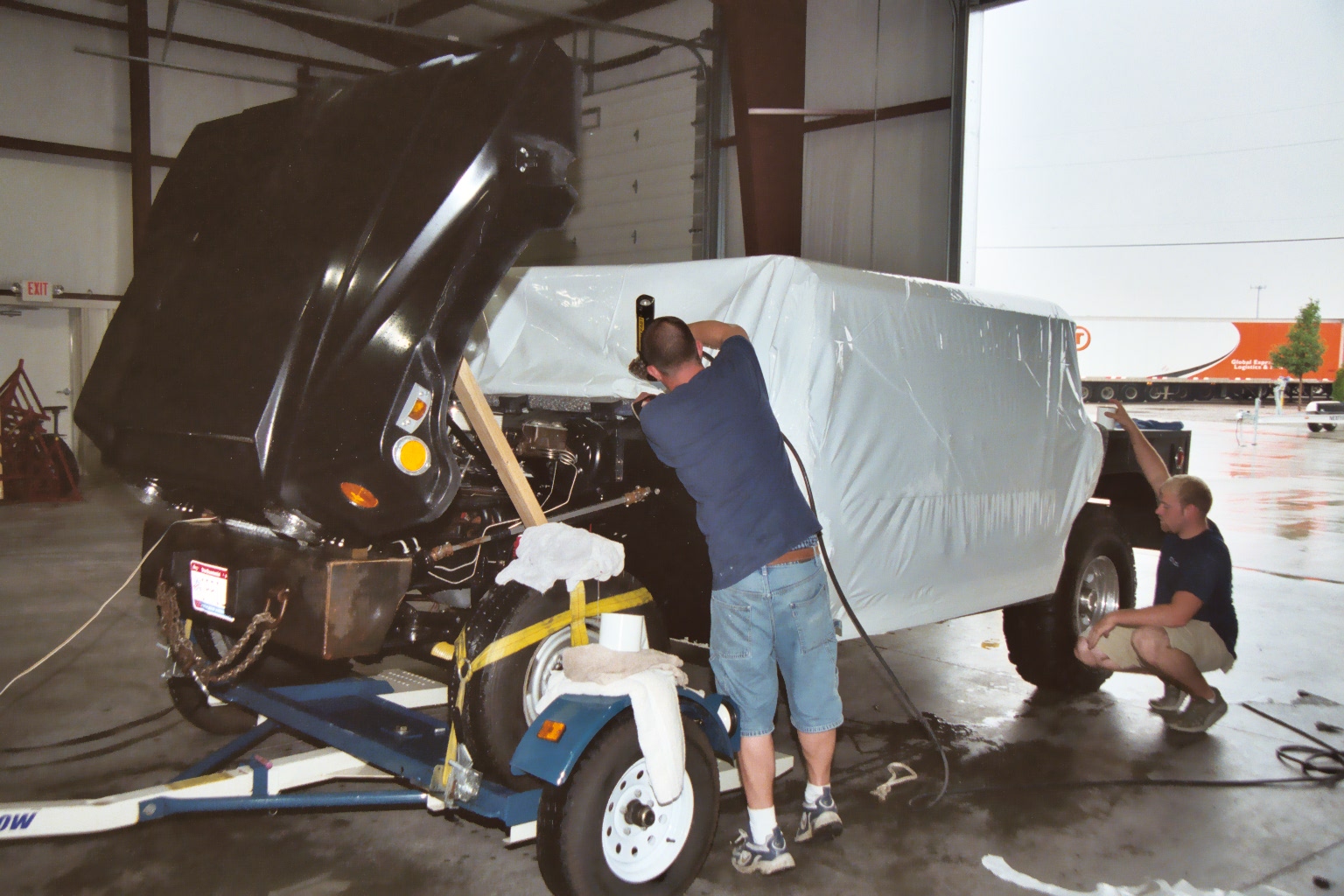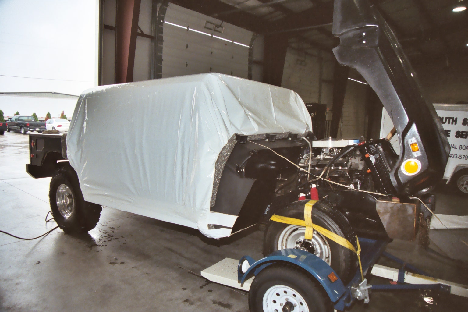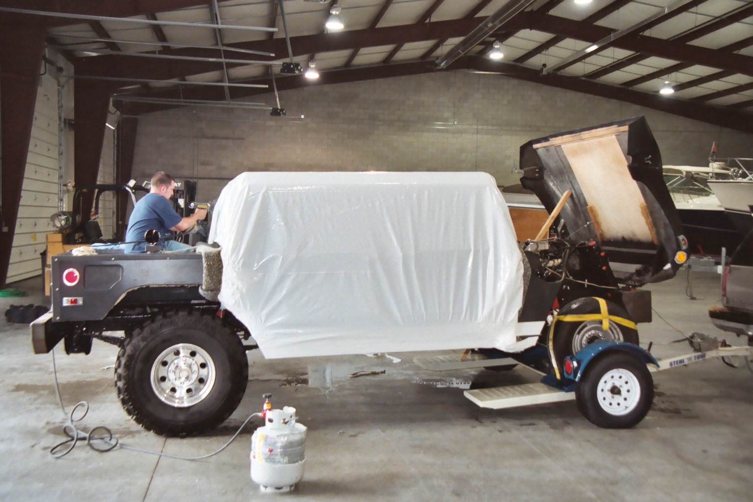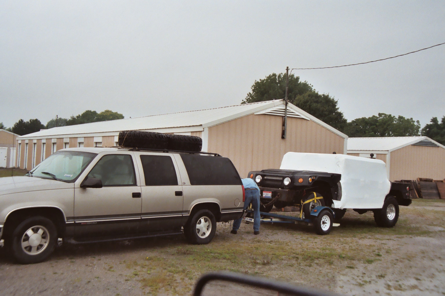 | We unexpectedly needed to move to Idaho for family medical circumstances in July of 2004. This caused us a dilemma with our Gorilla project. A commercial carrier wanted $2000 for the Gorilla's relocation. Too much! In the end, we felt like the most economical way to move it across country, unfinished, and un-glassed, was to use a tow dolly. Our project was a full 84-1/2 inches wide and wouldn't fit on any trailers that we could rent or borrow, one-way. The widest tow dolly was 80 inches, but we were able to make our project fit with stock wheels and tires up front. We had two inches to spare on both sides. The tow dolly was a heavy duty Stehl Tow with electric brakes. It was used. We bought it for $900 dollars. Next we loaded about a ton of tools and parts into the Gorilla and towed it to the local marina where friends shrink-wrapped our vehicle. With a pair of magnetic turn and brake signals we set off for Idaho from Ohio. We decided to take the high road (I-80 to I-90), and went across the top of the United States. We even crossed the Big Horn Mountains of Wyoming, and went through Yellowstone National Park, down to the Tetons, and then across to Idaho Falls. Total trip was 1800 miles. We sold the tow dolly as soon as we got our Gorilla into our new garage. The tow dolly went for $750. The shrink wrap was $275. Altogether we spent less than $500 for the tow. That's a far cry better than $2000, and we got to show off our truck for 1800 miles. |