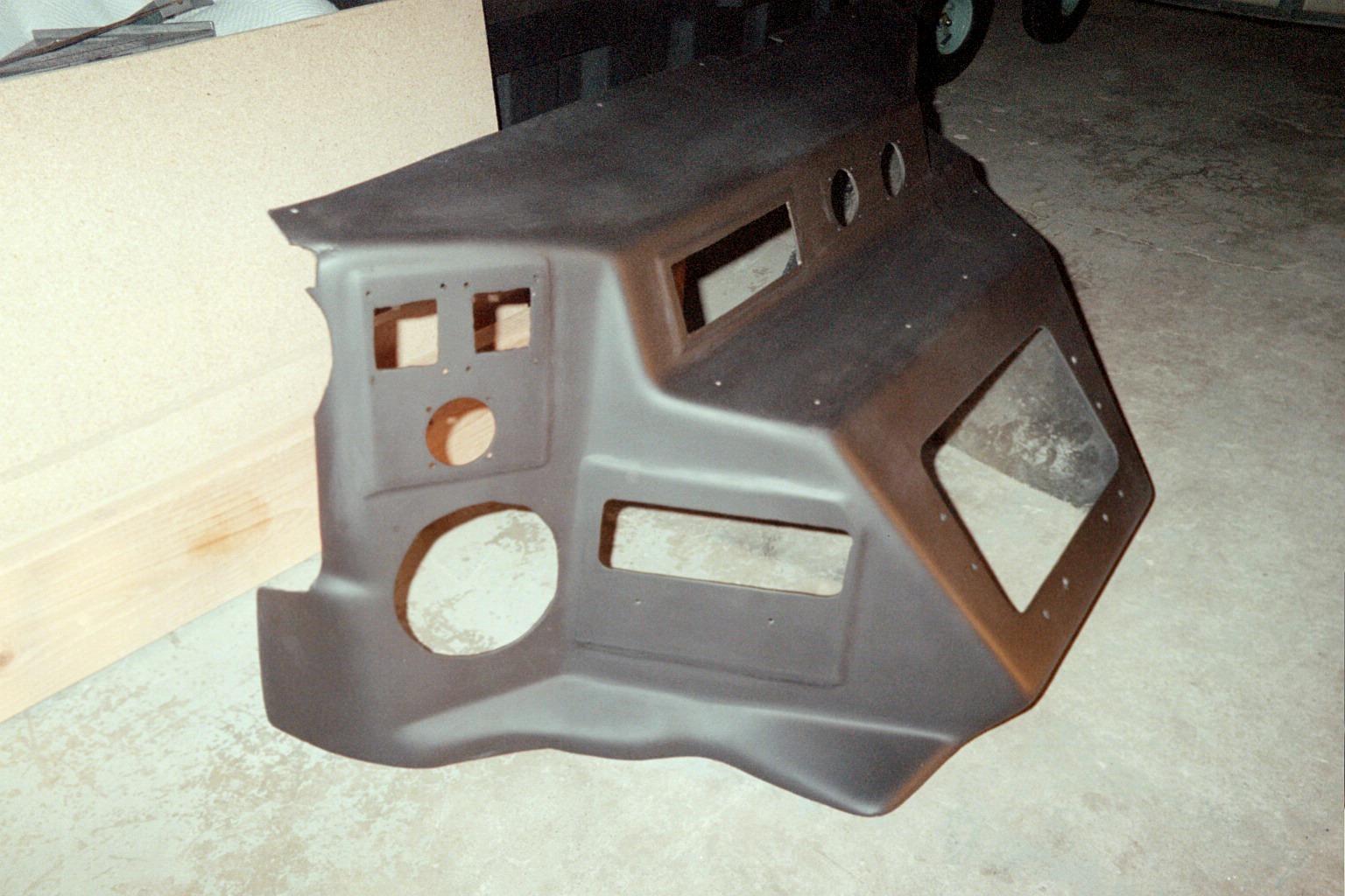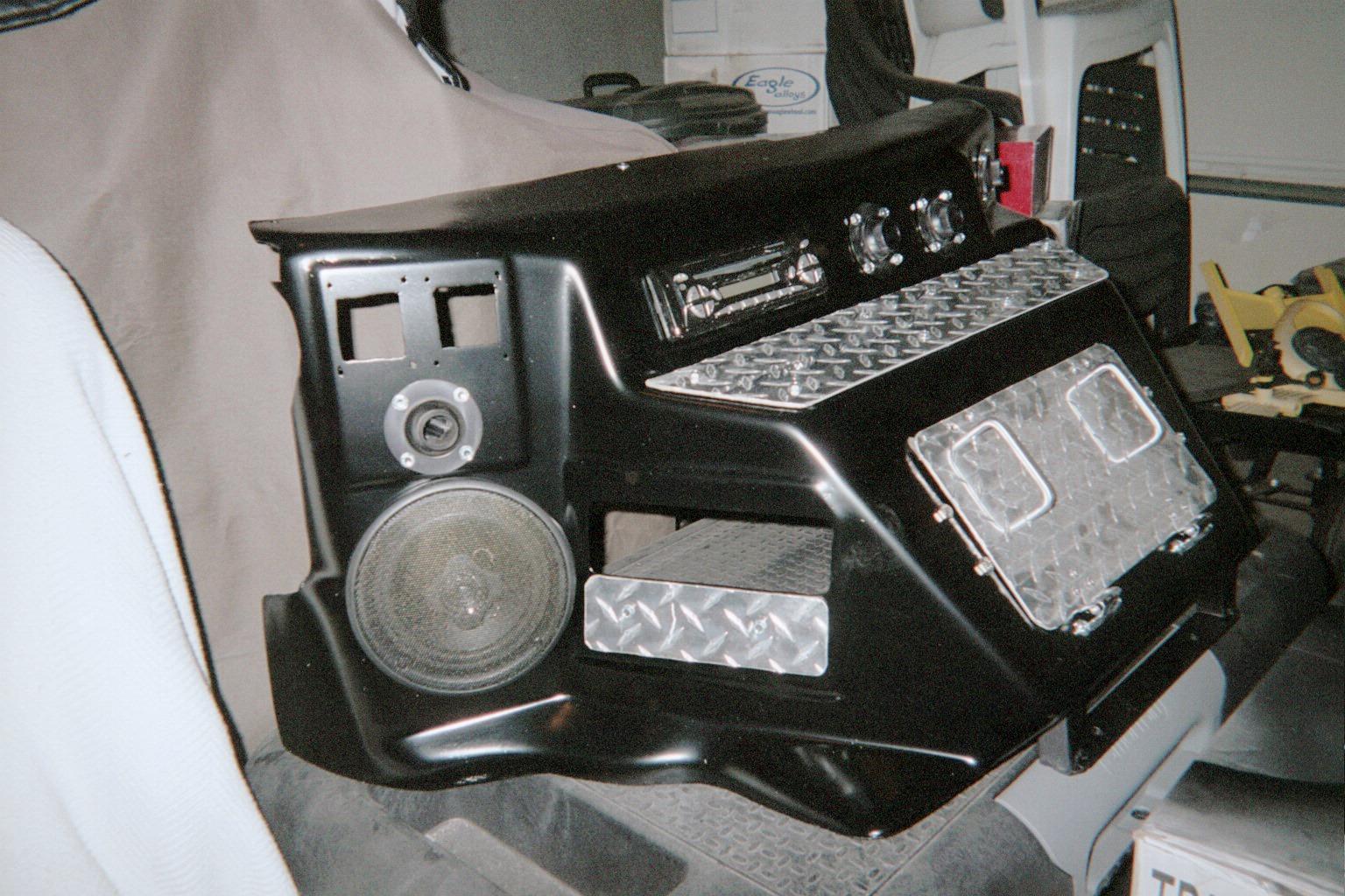 | This is the Urban Gorilla-supplied dog house after we got hold of it. We used hole saws, saber saws and a die grinder to make our openings. The speaker openings required an odd size (4.9 inches), so we cut a 4.5" hole and enlarged it with a saber saw and deburring grinder. The speaker holes weren't as easy as the others. We also drilled some holes for the various screws and fasteners needed for our accessories. After that we hand-sanded the fiberglass, primered, sanded again, primered again, then put on a black lacquer spray. We sanded that black lacquer finish once, and re-sprayed it. Once dry, we installed all the various accessories, and some polished aluminum diamond tread, and ended up with the black and chrome-like design below. Just what we were after. |