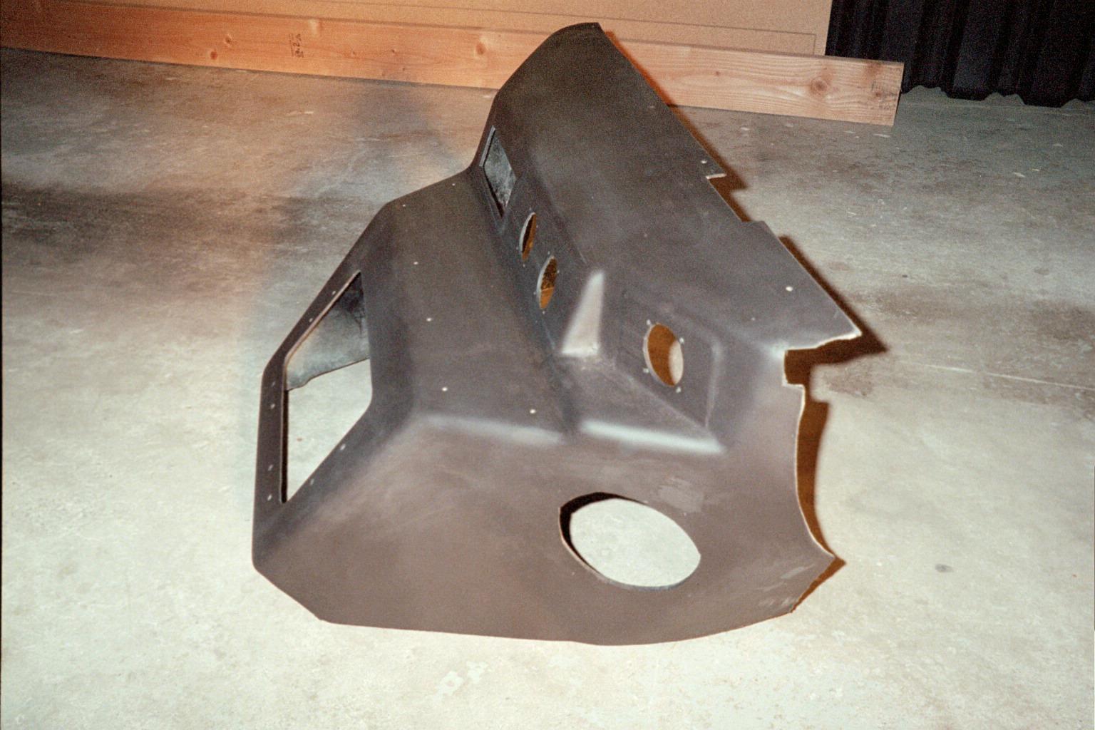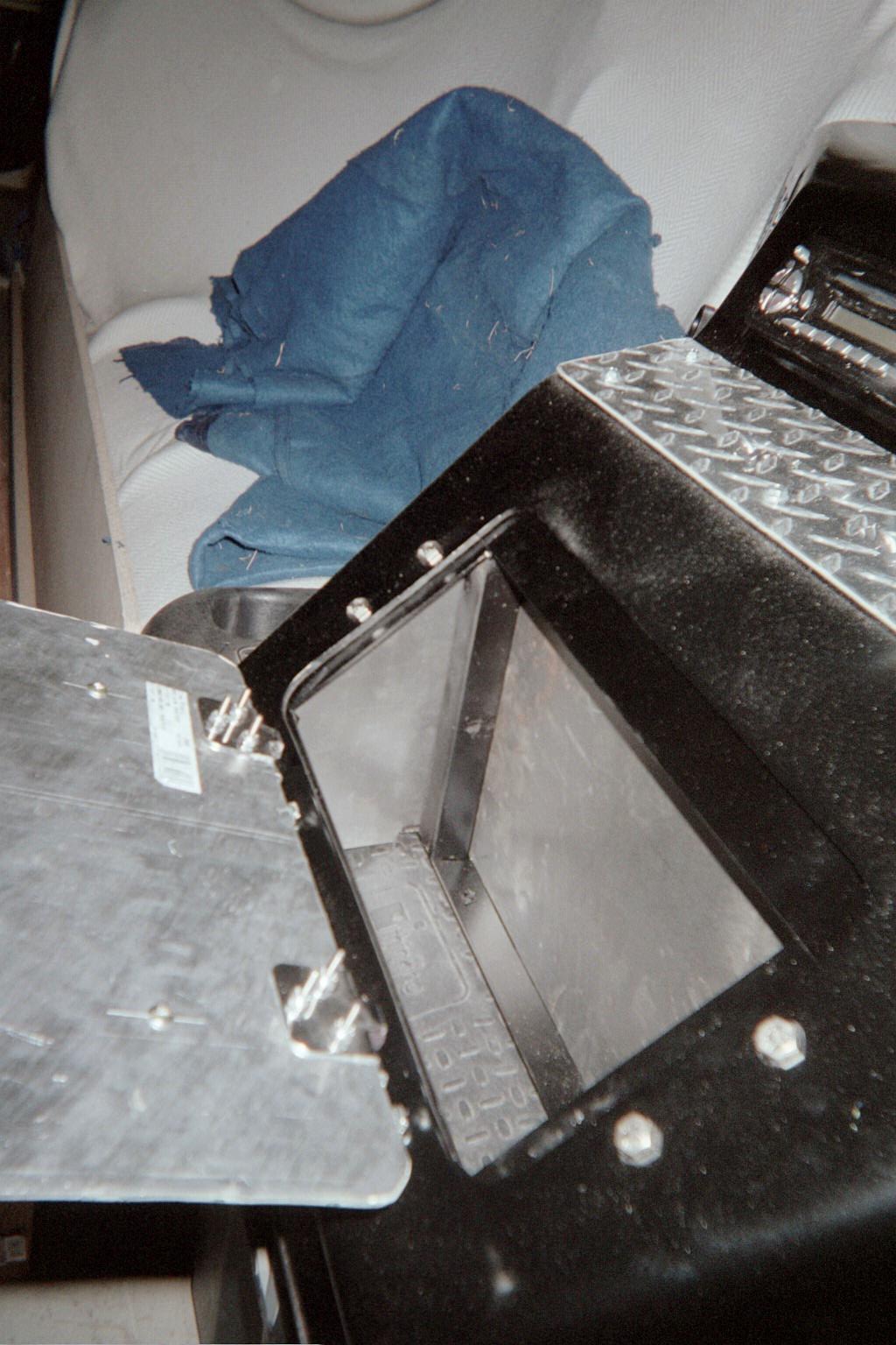 | As you can see above, our glove box was made from square tubing and some 18-gage steel sheet that we had laying around. We fastened the box to the under-side of the dog house and made a polished aluminum diamond tread plate for the door. Our ventilation accessories were purchased from Aircraft Spruce (ACS), and are 2", aluminum eyeball sockets. They twist open and shut, and point up to 60 degrees in any direction. On the back of the ventilators is an ACS-supplied adapter that allows mating the ventilation ducting to the ventilator. We chose a black and chrome-like radio scheme to stay as close as possible to our black and chrome them. It is a low-end sound system, but we never really had an appreciation for those things. Once we are finished with the interior carpeting and the seats are ready to be re-installed, we will connect all the air conditioning and sound accessories, and complete the dog house installation. |