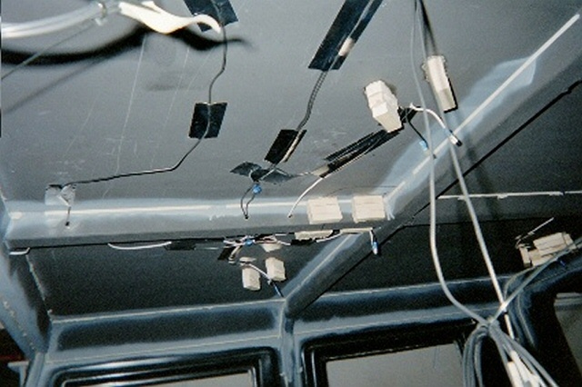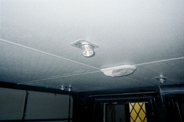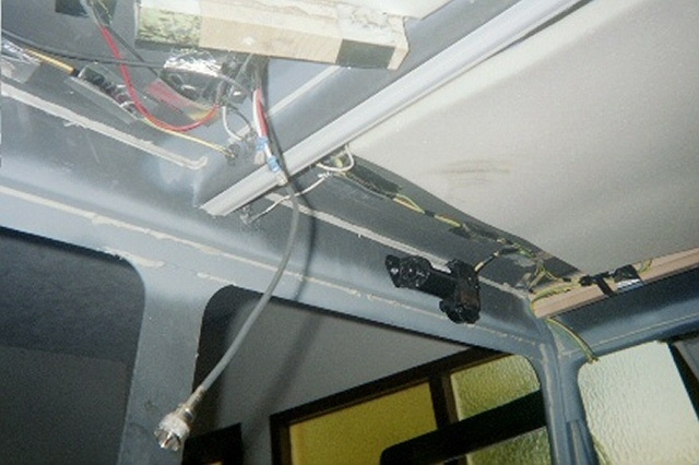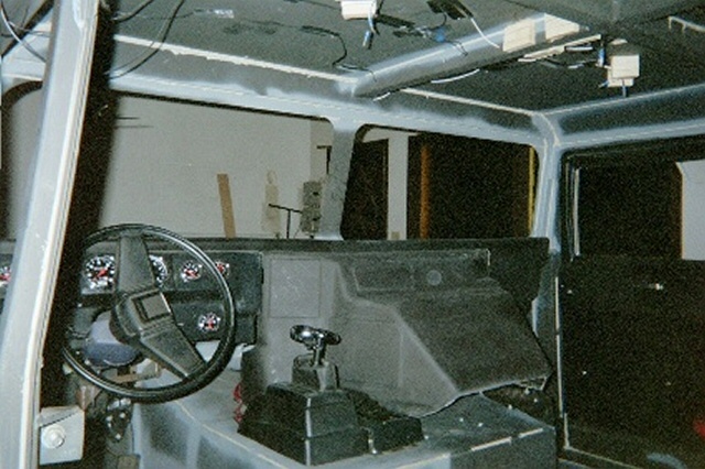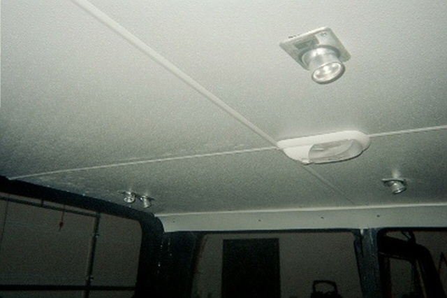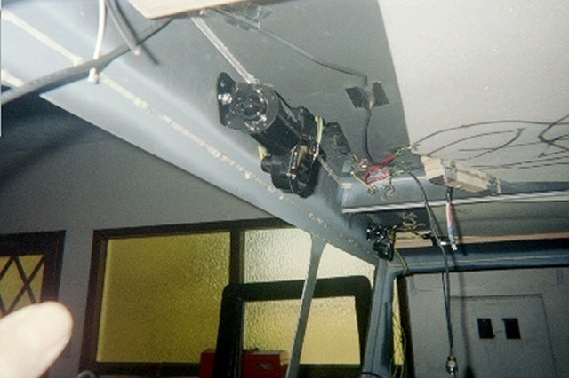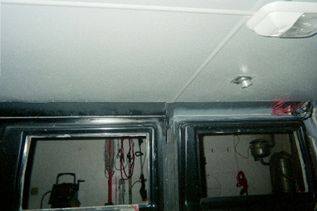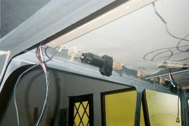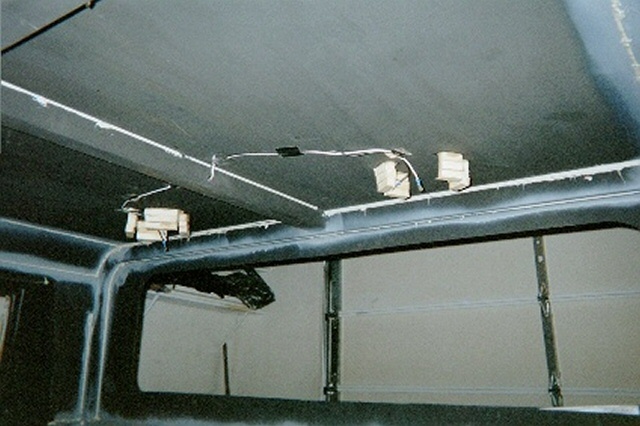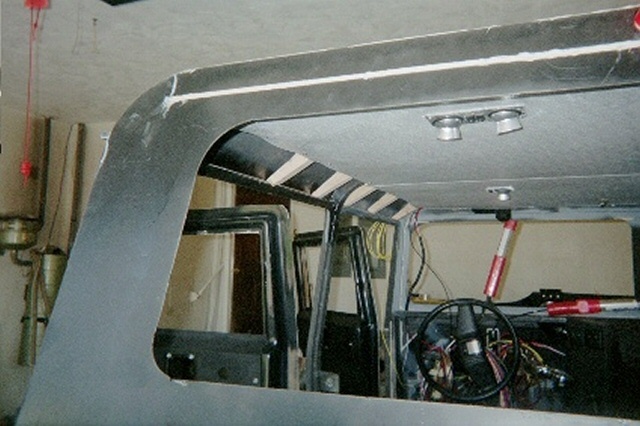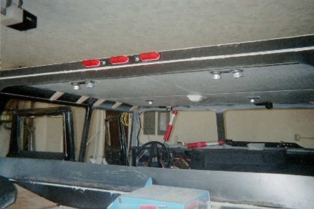 | Step 15 Ceiling Lights, Wiper Motors and Headliner Next came our ceiling light electrical work and the headliner. We wanted some aesthetics in the interior, as well as some function. We decided that our ride needed a dome light, as well as reading lights. We took considerable time pondering the best way to suspend the lights, and what type of headliner we could make to look good. No way did we want a fabric headliner. In the end, Bush Pilot's Badlands "Home Built Hummer" held sway over our decision. He installed very rugged and sharp plastic paneling in his truck, and it looked great! We went looking for similar stuff, and found that Lowe's had some fiberglass shower paneling that would look good as a headliner. Using industrial strength adhesives, we glued in several wooden blocks as light fixture bases, and the paneling molding tracks to hold up our ceiling. We ran the lighting wiring for the ceiling lights, dome lights and the exterior clearance lights. Then we installed 1" foam insulation, followed by 1" of OEM sound and heat insulations. Before we leave the wiring too far behind in the discussion, it should be noted that we grounded the lighting circuits in the ceiling beams, and then used PVC caulk to prevent any sharp edges from wearing through the wire insulation. Next came the wiper motors. These were easy to install once we decided on a good location for the wiper shafts. This was a bit challenging until we took the wiper arms and blades, and simulated as best as we could, where the blade woud swipe the windshield halves. With that dilemma behind us, we drilled our pilot holes, and used our Uni-bit to open up nice smooth holes for the wiper motor shafts. Then we ran the wires from the motors to the switch, and the switch to the wiring harness buse block. Using our best electrical judgement, and no wiring diagram, we thought we did a good job. With our family emergency electrical generator battery, we ran a test on the wiper motors and found that they didn't work properly. We called Cleveland Electrical, the manufacturer, and they explained that the wiper motors were self-parking, and that we needed to modify our wiring. They faxed us a wiring diagram that made all the difference in the world. Once rewired, a second test was run, and all was well. Before we closed up the ceiling, we realized that we really wanted a ceiling mounted CB radio. We added another wood block for the radio, and ran power and antenna cables for the radio. We cut our fiberglass panels with a saber saw, and the slid very nicely into the paneling tracks. We added screws into the wooden blocks running along the curved ceiling above the doors, and voila, we had a very nice gray ceiling. Both of the ceiling side panels were cut, and we added some molding between the main panels, and the side panels and the whole ceiling was complete. Our reading lights and dome light came from the RV section of the JC Whitney catalog. We ran a test on our ceiling lights, and they all worked great. Finally, after we complete the tear down, and painting of our project, we will add some insulation and paneling to the front interior windshield columns, left and right, to fully enclose all the structural metal up front. Along the rear window and rear ceiling pillars, we will add insulation and paneling there as well in order to heat insulate the truck, and reduce road noise. |