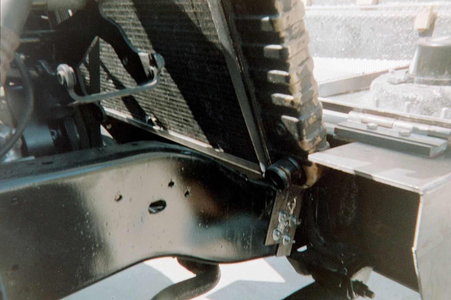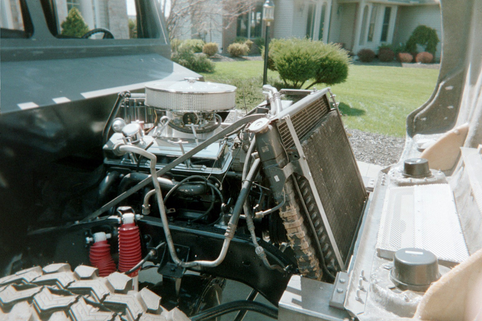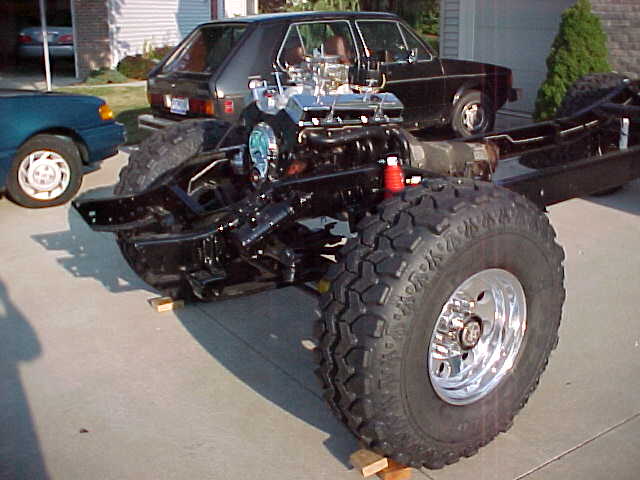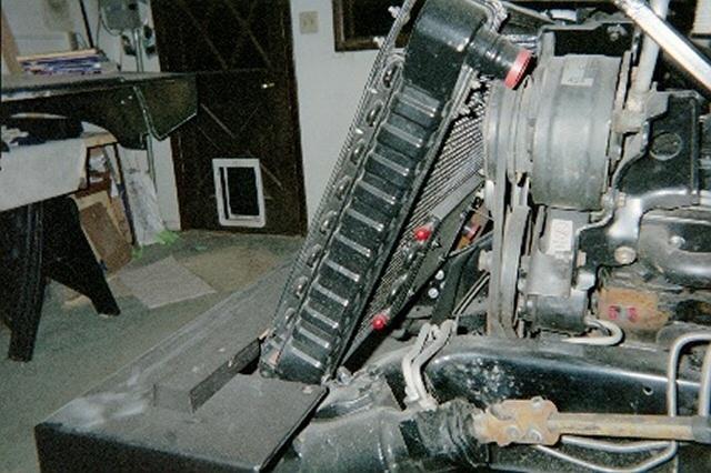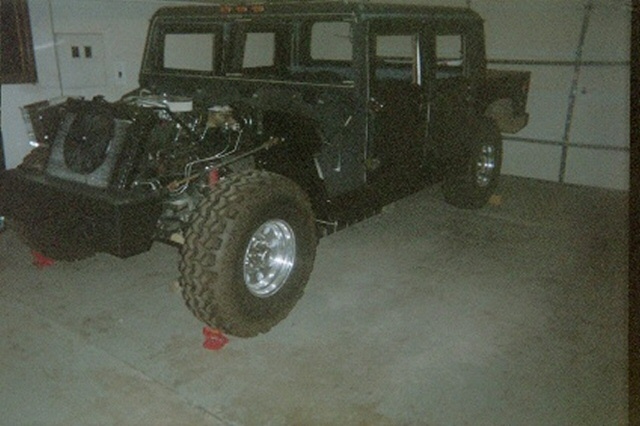 | STEP SIX: Attach the Bumpers It was necessary to remove approximately 8-inches from the front frame rails. You can see the front frame horns that we later cut off just ahead of the front leaf spring forward shackle mount. Our "Sawz-all" worked great at making thes cuts. Fast and easily controlled. We then weld-prepped the frame ends to get a good fit-up with the front bumper. We considered bolting the bumper to the frame, but due to shop limitations (no box brake to bend metal, and no drill press), we ended up going with permanently mounted bumpers. We used floor jacks and two-by-fours to hold the bumper in place during visual fit-up. Once we sighted-in the bumper we rallied a fiew friends to hold the hood over the front bumper to make sure we got the bumper at the right elevation and that the hood looked right coming off the top of the firewall. We also checked that we had good visual flow for the hood lines. we made one height adjustment on the bumper, and tacked it in place with a stick welder. Next we did the same thing on the rear bumper. Almost 12-inches were cut off the rear frame horns. The rear-most cross member had been removed for the body mount. To us, we wanted to adjust the length of the rear horns for a visually pleasing bumper fit, but we also wanted to stiffen the rear of the frame with the bumper. At 3/16" thick, the bumper was going to give us the strength we were after. We did three production-style weld passes on it so we wouldn't be afraid anytime we decided to put a trailer on our bumper hitch. STEP SEVEN: Attach the Radiator and Hood to the Frame We bought an Urban Gorilla hood with our kit for two reasons: First, we had no idea how to find or buy an H1 hood, and second . . . we weren't doing an engine relocation so the radiator wasn't going to fit under the standard H1hood location. In retrospect, we would probably go with a stock H1 hood and repair/modify it as necessary. Maybe next time!?! The original donor radiator was used to design and mock-up a radiator frame that would fit in our project's configuration. With the old radiator, we used the Urban Gorilla-provided radiator top and bottom plate, and two 3/4-inch square tubes with 90-degree bends to form the two rear braces. We had to cut a large section out of the hood and we designed side brackets to mount the radiator to the frame rails, just aft of the forward leaf spring shackle. 3/4-inch square tubing was used to hold the radiator at the right angle (approximately 48.5 degrees). We used stainless steel fasteners to mount the radiator to the truck's frame. We had very little clearance below the hood, so we added some shim blocks to the hood to boost the front end of the hood a total of 3/4". The photo to the left only shows one of the shim blocks. The hood had a steel stiffener that ran the bottom interior length of the fiberglass front so the hinges could have something structural to attach to besides the fiberglass only. We aligned the stiffener and bumper shims with the hinges at the best place on the bumper, and drilled all the holes we needed. After the holes were drilled, the hood was bolted in place. On the firewall we added some commercial truck bumpers to give us the right elevation to rest hood. We them simply sighted-in the hood holding straps, drilled the holes in the body just aft of the wheels, and mounted the straps. With the hood firmly in place, we used hole saws to drill-out the headlight and turning signal holes. After those holes were made we removed the hood, and used a saber to cut the grill openings. Two wooden frames was made to mount some APC, Inc., polished aluminum wire mesh screens in order to protect the radiator. We bought the wire mesh through JC Whitney. On the next page you can see the near-final hood configuration. It will get a bit more cosmetic work prior to painting. |