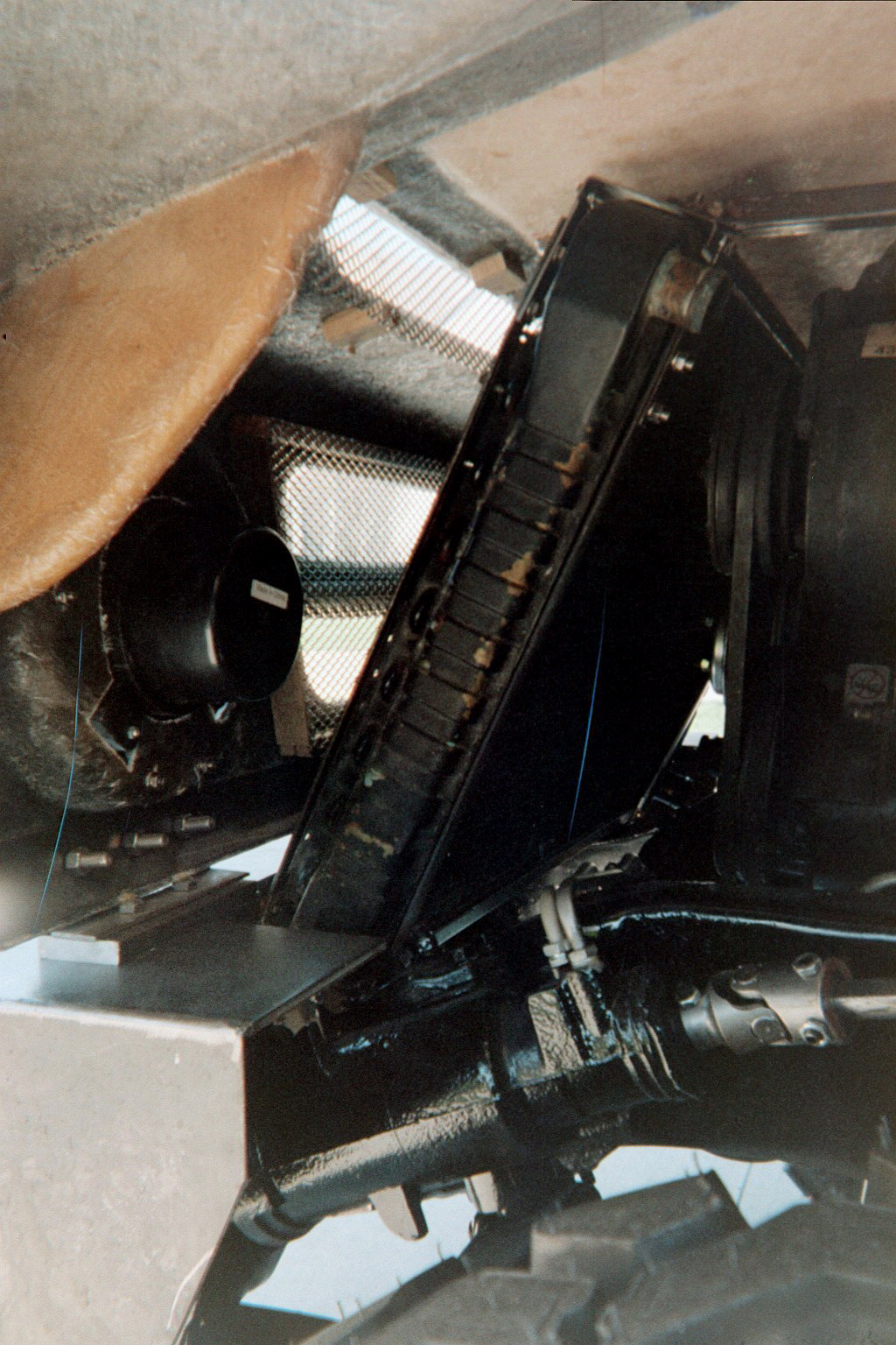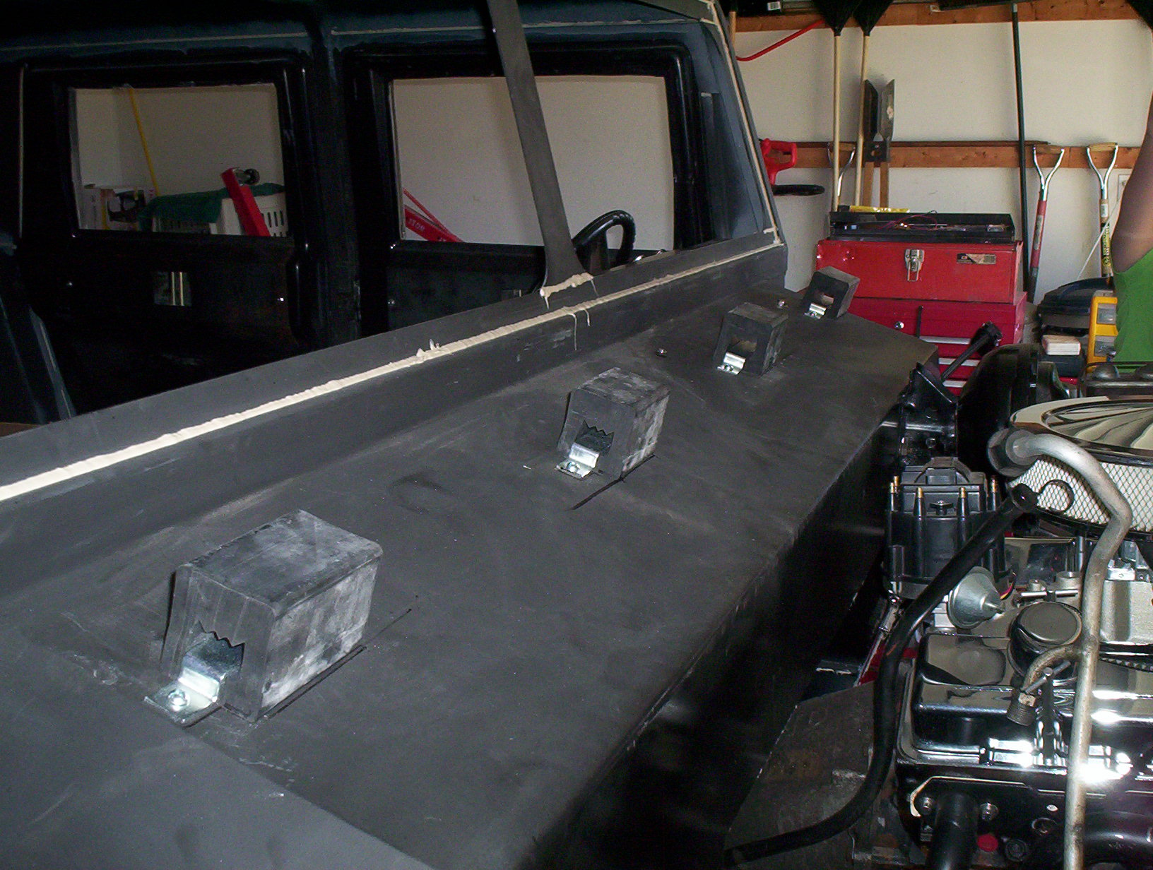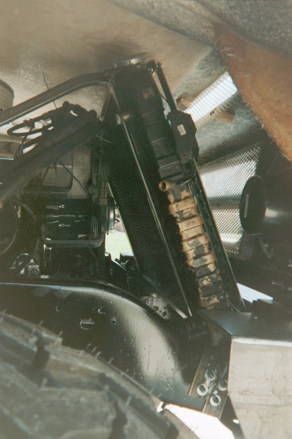 | STEP SIX: Attach the Bumpers It was necessary to remove approximately 8-inches from the front frame rails. You can see the front frame horns that we later cut off just ahead of the front leaf spring forward shackle mount. Our "Sawz-all" worked great at making thes cuts. Fast and easily controlled. We then weld-prepped the frame ends to get a good fit-up with the front bumper. We considered bolting the bumper to the frame, but due to shop limitations (no box brake to bend metal, and no drill press), we ended up going with permanently mounted bumpers. We used floor jacks and two-by-fours to hold the bumper in place during visual fit-up. Once we sighted-in the bumper we rallied a fiew friends to hold the hood over the front bumper to make sure we got the bumper at the right elevation and that the hood looked right coming off the top of the firewall. We also checked that we had good visual flow for the hood lines. we made one height adjustment on the bumper, and tacked it in place with a stick welder. Next we did the same thing on the rear bumper. Almost 12-inches were cut off the rear frame horns. The rear-most cross member had been removed for the body mount. To us, we wanted to adjust the length of the rear horns for a visually pleasing bumper fit, but we also wanted to stiffen the rear of the frame with the bumper. At 3/16" thick, the bumper was going to give us the strength we were after. We did three production-style weld passes on it so we wouldn't be afraid anytime we decided to put a trailer on our bumper hitch. STEP SEVEN: Attach the Radiator and Hood to the Frame We bought an Urban Gorilla hood with our kit for two reasons: First, we had no idea how to find or buy an H1 hood, and second . . . we weren't doing an engine relocation so the radiator wasn't going to fit under the standard H1hood location. In retrospect, we would probably go with a stock H1 hood and repair/modify it as necessary. Maybe next time!?! The original donor radiator was used to design and mock-up a radiator frame that would fit in our project's configuration. With the old radiator, we used the Urban Gorilla-provided radiator top and bottom plate, and two 3/4-inch square tubes with 90-degree bends to form the two rear braces. We had to cut a large section out of the hood and we designed side brackets to mount the radiator to the frame rails, just aft of the forward leaf spring shackle. 3/4-inch square tubing was used to hold the radiator at the right angle (approximately 48.5 degrees). We used stainless steel fasteners to mount the radiator to the truck's frame. We had very little clearance below the hood, so we added some shim blocks to the hood to boost the front end of the hood a total of 3/4". The photo to the left only shows one of the shim blocks. The hood had a steel stiffener that ran the bottom interior length of the fiberglass front so the hinges could have something structural to attach to besides the fiberglass only. We aligned the stiffener and bumper shims with the hinges at the best place on the bumper, and drilled all the holes we needed. After the holes were drilled, the hood was bolted in place. On the firewall we added some commercial truck bumpers to give us the right elevation to rest hood. We them simply sighted-in the hood holding straps, drilled the holes in the body just aft of the wheels, and mounted the straps. With the hood firmly in place, we used hole saws to drill-out the headlight and turning signal holes. After those holes were made we removed the hood, and used a saber to cut the grill openings. Two wooden frames was made to mount some APC, Inc., polished aluminum wire mesh screens in order to protect the radiator. We bought the wire mesh through JC Whitney. On the next page you can see the near-final hood configuration. It will get a bit more cosmetic work prior to painting. |