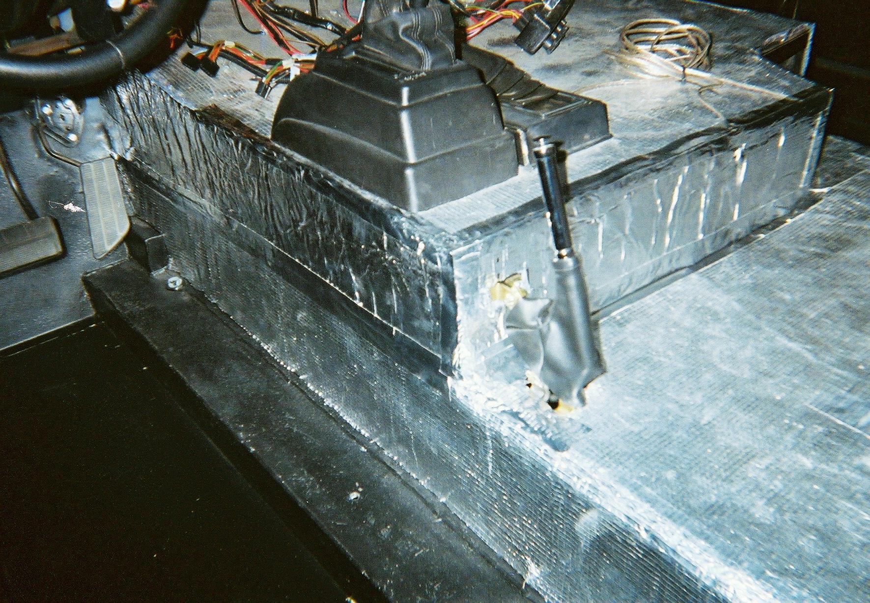 | Our parking brake was one of those things we kept putting off. It wasn't nearly as fun as installing the steering wheel or dash board, but it is one of those mechanical systems that is needed to get our project titled and registered with the State of Idaho. We put it off as long as we could, but we are getting very close to a start-up and test drive, so we had to gitt'er done! Dad realized that we better have a parking brake so we can safely start the engine too. There is no real chance of a problem with the truck moving because transmission shifter is installed and operational, but we really want the truck to stay in one place when we do our start-up testing, which is in the very near future. We kicked around exactly how to hook up an emergency brake. The donor truck's old pedal system was out of the question. No realistic way to make it work. Finally, we settled on a Lokar, chrome plated, universally mounted hand brake. It has a ratchet styled pull, with a thumb button release and a black vinyl boot. We chose a two-dimensional mount. It is positioned just to the rear of our B&M Hammer shifter on a 45-degree, rising angle, next to the driver's right thigh. The front of the handle base is mounted on the vertical back-side of the front engine tunnel. The rear handle base is mounted on the horizontal drive train tunnel. We used a brand new stock Suburban parking brake cable from LMC Truck and made a stock undercarriage connection. Then we threaded it through four home-made cable hangers along the interior and exterior of the left frame rail. We knew it would be too long so we planned for it to go forward and curve back, then up vertically where it connected to the hand brake. The cable hangers were made from the old front and rear frame horns, cut-down, shaped and bolted to the frame. The rear-most hanger, and the forward most hanger required exact hole sizes for the brake cable armored clips to snap into. These keep the armored cable jacket in place, and actually provide the mechanical thrust points for cable action. The two middle hangers had no critical dimensions. The rear mechanical brake lines were in good condition, but the stock turnbuckle, where the new brake cable attached, had a rusty adjustment fastener. We tried to loosen it with WD-40 and a wire brush, in order to take out slack in the cable, but we still ended up with a seized fastener. We had to cut it off and use a new fastner. Overall, the installation was very straight forward; however, it took several attempts to adjust the undercarriage linkage in order to get the brakes to engage when pulling the handle. Now we can get the big 37" Super Swampers to chirp when we push the truck out of the garage and "slam" on the parking brake. We guess this part of the build has been successful. In the lower picture just to the right you can see the dog house has been removed so the truck will be easier to mask and paint. |