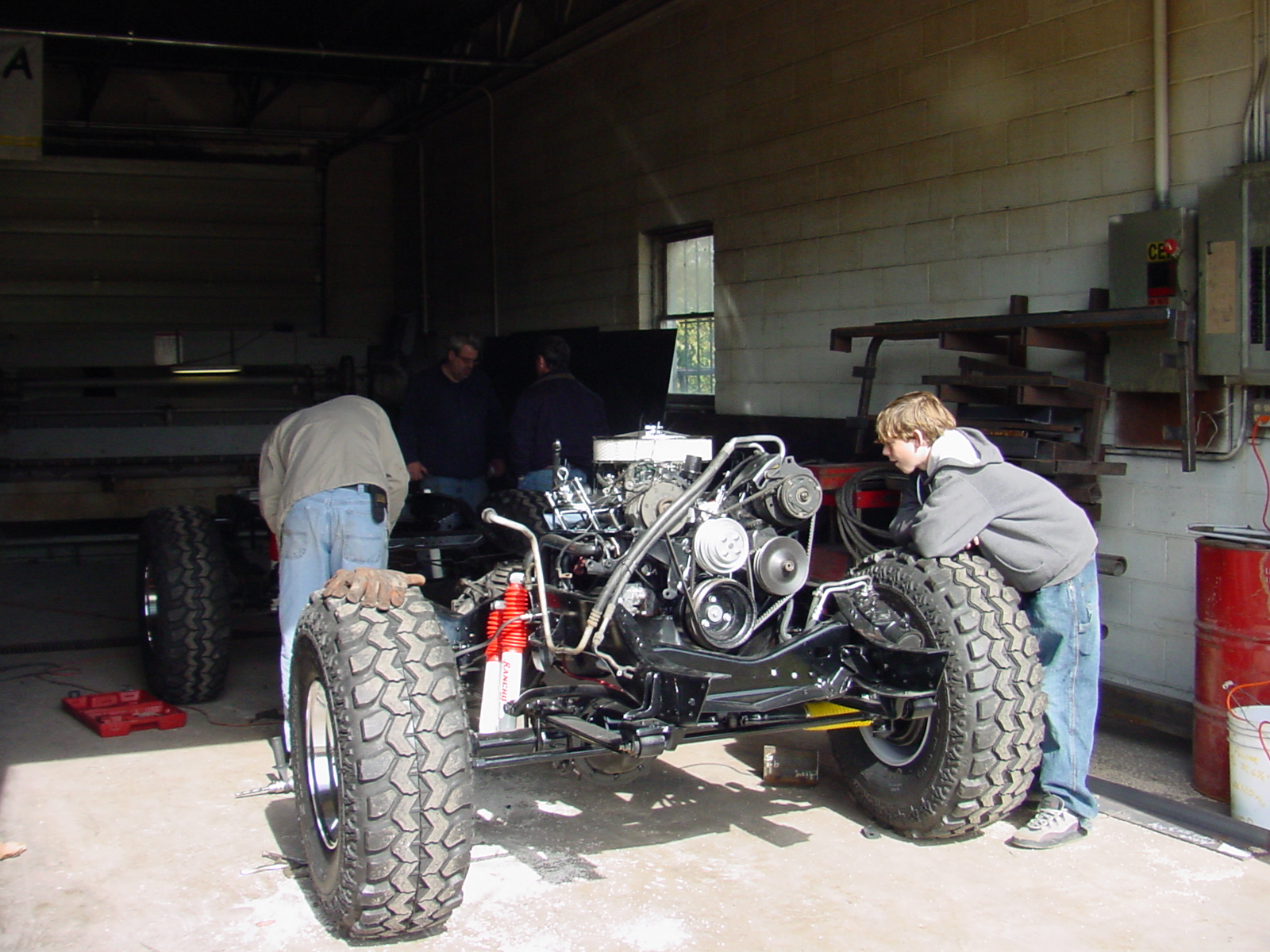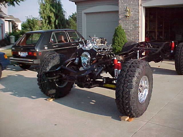| The post card to the left shows our progress as of August 2004. It's now November 2004 and we've made even more progress since then, but we have a good bit of work remaining before we can do a test drive. None of us had any automotive repair or building experience, but Dad is a nuclear engineer and retired navy officer with quite a bit of technical experience. We depend a lot on the H1-Forum and calls to Urban Gorilla to get us through the build. Us boys were 13 and 14 at the start of the build in the spring of 2003. Our project describes the basic steps in how we have tackled building our Gorilla. STEP 1: Find a Donor Our first task was to find a suitable donor. We purchased a 1986, 3/4-ton Chevy Suburban. It had a 350 V-8 with factory quad shocks and steering stabilizer up front. It was driveable, but was in bad shape. It was a rusty heap, with oil leaks everywhere. As soon as we got it home we popped it into the garage so we wouldn't offend our neighbors. Unfortunately we are hillbillies and we lived in an upscale neighborhood. We had to be on our best behavior so we would insult any sophisticates, or cause someone's property value to decrease. All banging, burning, sawing and grinding was stopped at 10:00 PM every night. STEP 2: Strip the Donor Truck to the Frame We stripped the truck down to its bare frame. We used grinders, sawz-alls, wrenches, hammers - whatever it took to get things out or off the frame. The three of us worked a couple hours a night for two weeks to get this step done. All body mounts were cut off the frame. We pulled all the wiring and wiring harness and stuffed them into plastic bags. Shocks were removed. Parking brake went into the junk pile. The heating and cooling lines were pulled. The A/C and heating components were pulled and kept for potential reuse or mock-up for new parts. The 40-gallon gas tank had about 7-gallons of gas still in it. We siphoned it out, dropped the tank. Filled it with water, then poked holes in it before sending it to the dump. (Our neighbors were really nervous when they saw this.) The engine, transmission, transfer case and drive shafts were pulled as well. We had no intention of saving the engine, but the rest of the drive train was removed so we could blast and repaint the frame. STEP 3: Sand Blast, Prime and Paint the Frame We had professionals haul-off the frame and blast it to bare metal. They then primed and black clear-coated it. When we got the frame back it looked brand new and was squeaky clean. We almost left it in the driveway for everyone to see and enjoy with us, but one of the neighbors gave us a look that said he thought we were red necks. If he only knew how much hill billy potential we really possessed. As you can see to the left, the frame looks really good sitting on 37-inch Super Swamper Radials and Rancho 5000 shocks. Our photo is a little ahead of the story, but we liked these pictures, and they show what you can do with a derelict donor truck if you will just give it a little love and patience.! |